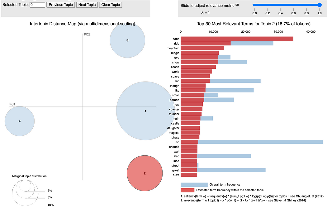 # Import and enable notebook to run visualizationimport pyLDAvis.gensim_modelspyLDAvis.enable_notebook() vis = pyLDAvis.gensim_models.prepare(lda_model, corpus, dictionary=lda_model.id2word)vis