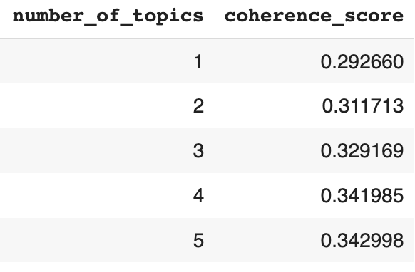 from gensim.models importCoherenceModel # Compute coherence scorenumber_of_topics =[]coherence_score =[]for i in range(1,10): lda_model = gensim.models.ldamodel.LdaModel(corpus=corpus, id2word=id2word, iterations=50, num_topics=i) coherence_model_lda =CoherenceModel(model=lda_model, texts=reviews['Review_Clean_List'], dictionary=id2word, coherence='c_v') coherence_lda = coherence_model_lda.get_coherence() number_of_topics.append(i) coherence_score.append(coherence_lda) # Create a dataframe of coherence score by number of topics topic_coherence = pd.DataFrame({'number_of_topics':number_of_topics,