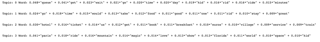 for idx, topic in lda_model.print_topics(-1):print("Topic: {} Word: {}".format(idx, topic))