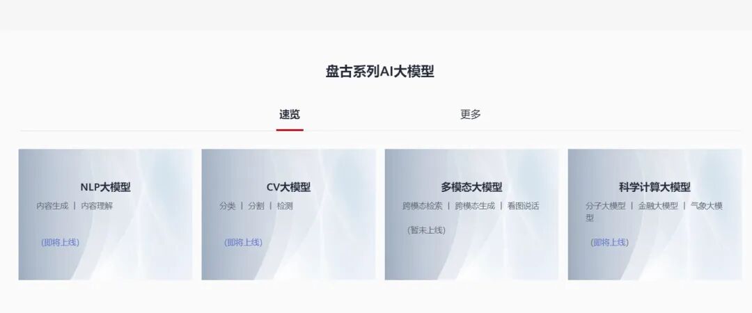 公开资料显示,华为盘古大模型于 2021 年 4 月正式对外发布,后来又在 2022 年 4 月升级到 2.0 版本。目前,AI 大模型中的 NLP 大模型、CV 大模型以及科学计算大模型(气象大模型)均已被标记为即将上线状态。