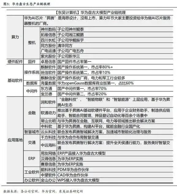 东吴证券梳理的华为盘古大模型产业链研报中指出,华为盘古大模型的优势在于人才储备和算力自主可控,有望成为国内领先的大模型,其生态产业链标的有望迎来加速发展,包括拓维信息、四川长虹、麒麟软件(中国软件)、统信软件(诚迈科技)、麒麟信安等华为生态公司。国盛证券则认为,华为盘古为首个多模态千亿级大模型,有望赋能百业。