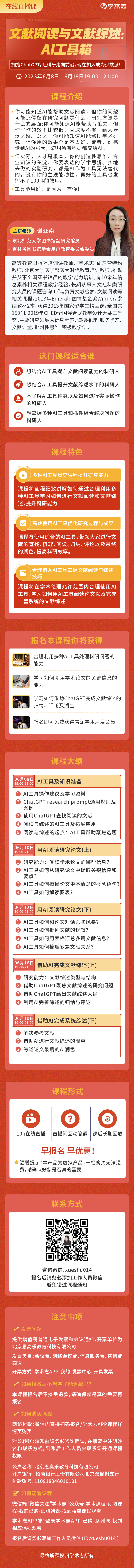 在人工智能时代,如何合理借助AI工具的力量辅助科研,做好文献阅读和文献综述?学术志特地开设了一门《文献阅读与文献综述:AI工具箱》直播课程,主讲老师是谢亚南老师,谢老师有10余年信息素养相关课程教学经验,长期从事人文社科类研究人员的课题咨询工作。并且在学术志平台开设过文献检索、文献阅读等相关课程,收获了众多学员的好评。在本次课程中,谢老师将通过讲解多个AI工具,通过实际操作,带领大家高效寻找阅读文献,合理借助AI工具完成文献综述,并借助ChatGPT完善综述的归纳、评论及润色。