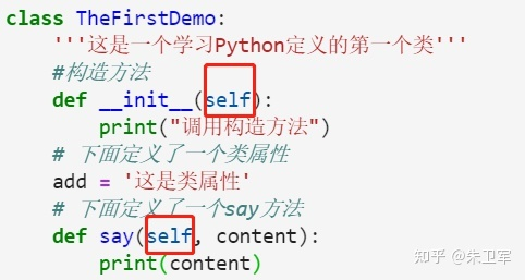 初学者会发现,类的方法(构造方法和实例方法)中都会有一个固定参数self,其实这个参数就是代表着实例(对象)本身,就像是一个身份证,实例可以凭着身份证去调用类方法。