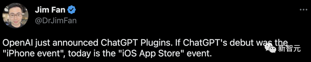 而李飞飞高徒、英伟达AI科学家Jim Fan也激动地表示,如果说曾经ChatGPT的横空出世可以看作“iPhone的出现”,今天第三方插件的集成,就是“iOS App Store”级别的事件。
