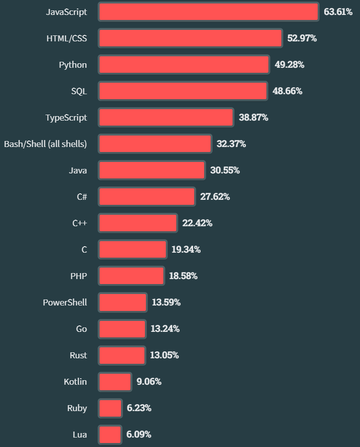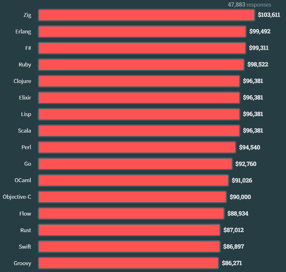 JavaScript 连续 11 年成为最流行编程语言,Python 取代 SQL 成为第三大流行编程语言。其他编程语言比如 Bash/Shell, C, Ruby, Perl 和 Erlang,它们的排名均上升了一位。Go 和 Rust 的使用情况占比与去年相比也有了一定的上升。报告显示,Zig 开发者的年收入中位数是103611 美元(合人民币约 74 万元)。Zig 作为一门通用编程语言,专为稳定性、可维护性和性能而设计,追求替代 C 语言在系统编程上的最佳地位。结合去年的数据来看,Zig 可谓是“横空出世”。去年薪资最高的 Clojure 则掉到了第 5 名。当然,参与这份问卷调查的开发者很少在中国工作,因此对于咱们程序员同胞来说,这些不同编程语言的薪资收入情况无法直接对比。PostgreSQL 取代 MySQL 成为今年最流行数据库。在专业开发者群体中,有 49.09% 的人正在使用 PostgreSQL,比去年上涨 2.61%;MySQL 占比 40.59% 位居第二,SQLite 占比 30.17% 位居第三,DynamoDB 占比 10.31% 超越 Oracle 排名第九位,Oracle 占比 10.06% 位列第十名。对于正在学习编程的人来说,更多的则是使用 MySQL,其采用占比为 45.71%。MongoDB 数据库则位居第二(占比 28.15%),其次是 SQLite(占比 26.93%)。Node.js 和 React.js 是最流行的两种 Web 技术。专业开发者使用两者的比例相当,而正在学习编程的人使用 Node.js 多于 React(52% vs 48%)。其他较受欢迎的还包括 jQuery、Express、Angular、Next.js 和 Vue.js。Visual Studio Code 仍然是大多数开发者的首选 IDE,今年它在所有受访者中的使用率从 75% 增加到 81%。ChatGPT 是最受欢迎的 AI 搜索工具,被 83% 的受访者使用,其次是 Bing AI (20%)、WolframAlpha (13%) 和 Google Bard AI (10%)。GitHub Copilot 是最受欢迎的 AI 开发工具,被 55% 的受访者使用,其次是 Tabnine (13%) 和 AWS CodeWhisperer (5%)。在使用或计划使用 AI 工具的人中,只有不到 3% 高度信任它们的准确性,而有两倍多的人(大约 6%)非常不信任。此外有 39% 的人对 AI 工具表示有些信任,30% 则表示没有所谓信不信任。绝大部分开发者使用 AI 工具帮助编写代码,其他的用途包括调试、写文档、学习代码库,以及测试等。无论是专业开发者还是正在学习编程的人,他们都相信开发工作流程将在一年内因为 AI 工具而有所不同。点此查看完整报告内容:https://survey.stackoverflow.co/2023/
