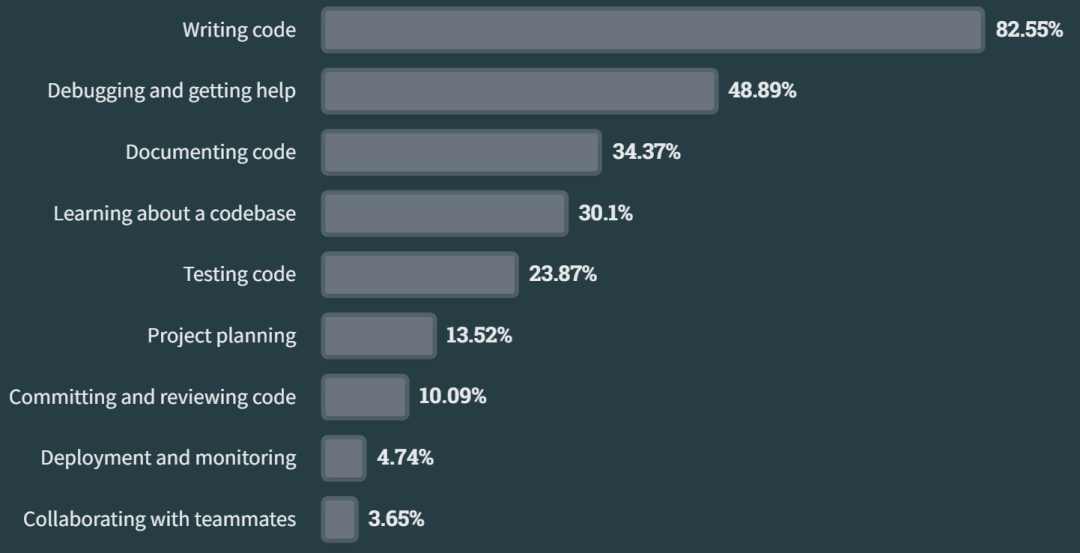 - 开发者使用 AI 工具的场景:82.55%开发者用于帮助编写代码