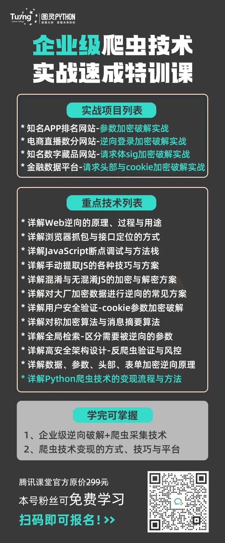 这是一套专讲爬虫逆向破解的高阶技术实战课,迄今为止已帮助近三万学员快速进阶。本次课程将由国际大数据竞赛获奖大佬亲身指导,带领大家进行高阶技术体系+逆向解析项目实战+技术变现路径指导的综合速成训练!