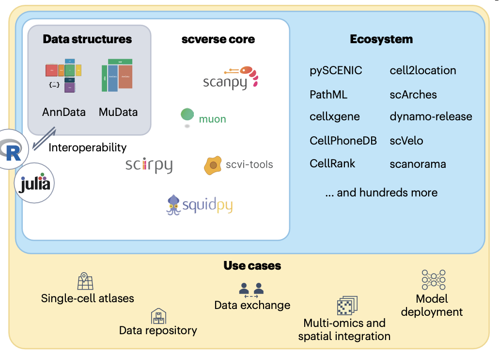 2023的4月份,看到了NBT的文章:《The scverse project provides a computational ecosystem for single-cell omics data analysis》,是单细胞领域跟Seurat齐名的scanpy团队的fabian,他号召业内人士建立一个 Python single-cell analysis ecosystem ,希望囊括全部的使用了Python开发的单细胞数据分析工具: