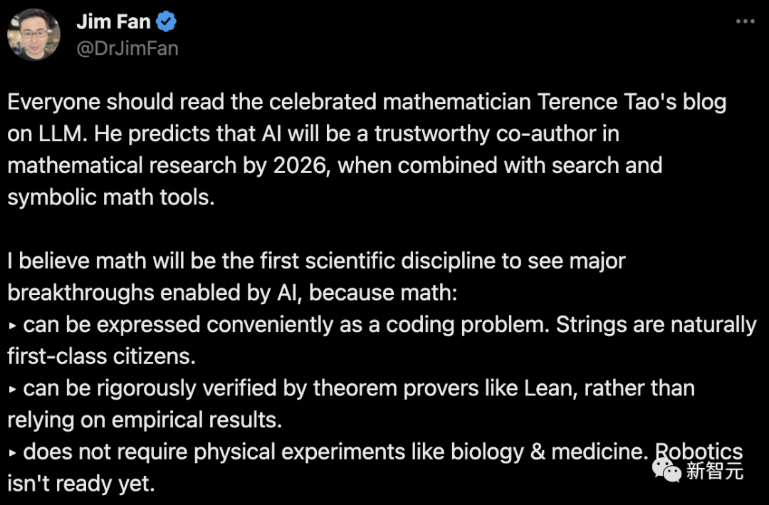 英伟达首席科学家Jim Fan激动转发称:见证人工智能实现重大突破的第一个学科,很可能就是数学!
