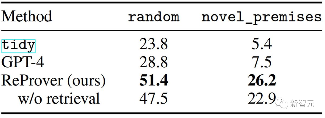 研究人员使用LeanDojo Benchmark来训练和评估ReProver。下图展示了10分钟内证明的定理的百分比。每一列代表不同的数据分割。ReProver的性能优于Lean内置的证明自动化策略(tidy),提供了一个无需检索即可直接生成策略的测试基准。研究人员采用的另一个基准是使用GPT-4以零样本方式生成策略。