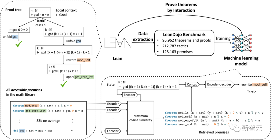 研究团队针对Lean进行了加工和改进,开发出了LeanDojo。它可以从Lean中提炼出人类撰写的证明过程,形成一个数据集。
