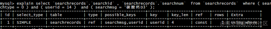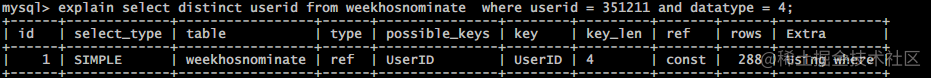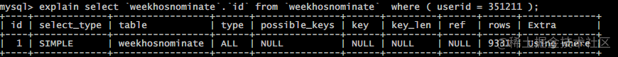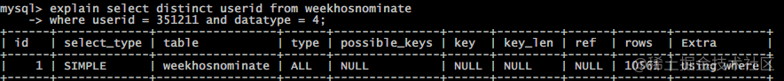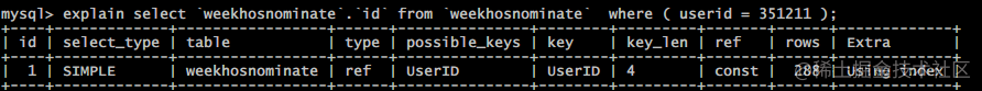 再次执行explain分析可以发现, 通过索引 userid 将范围由全表扫描的近万到索引指向的数十条记录.