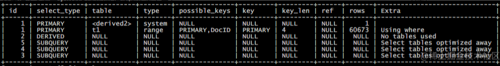 index_merge | 表示出现了索引合并优化(包括交集,并集以及交集之间的并集),但不包括跨表和全文索引。 这个比较复杂,目前的理解是合并单表的范围索引扫描(如果成本估算比普通的range要更优的话) |