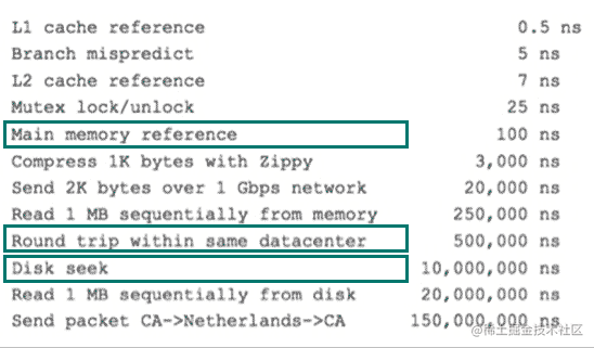 那么访问一次磁盘的时间,即一次磁盘IO的时间约等于5+4.17 = 9ms左右,听起来还挺不错的,但要知道一台500 -MIPS的机器每秒可以执行5亿条指令,因为指令依靠的是电的性质,换句话说执行一次IO的时间可以执行40万条指令,数据库动辄十万百万乃至千万级数据,每次9毫秒的时间,显然是个灾难。下图是计算机硬件延迟的对比图,供大家参考: