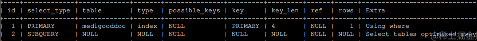 unique_subquery | 在in子查询中,就是value in (select...)把形如“select unique_key_column”的子查询替换。 PS:所以不一定in子句中使用子查询就是低效的! |