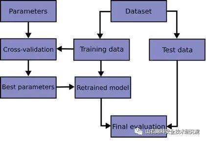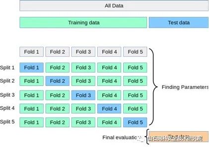 目前使用最为广泛的评估方法之一便是交叉验证,下图是模型训练中典型交叉验证工作流的流程图。右侧是数据的分割,分为训练集和测试集,训练集会调用Parameters参数范围进行交叉验证,直至获取最佳的参数。使用最佳参数对所有Training data进行训练,再对最先分出的Test data进行验证,取得最后的分数交叉验证既可以解决数据集的数据量不够大问题,也可以解决参数调优的问题。常见的交叉验证一般使用k折交叉验证。sklearn官方文档中给出了这样一张图很清楚地描述了k折交叉验证过程。它的思路非常简单:首先将数据集分为测试集和训练集,然后将训练数据随机均分k份。使用其中1份做测试集,剩余k-1份做训练集。通过 k 次训练后,我们得到了 k 个不同的模型。评估 k 个模型的效果,从中挑选效果最好的超参数。在sklearn中,用cross_val_score来实现交叉验证>>> from sklearn import datasets, linear_model