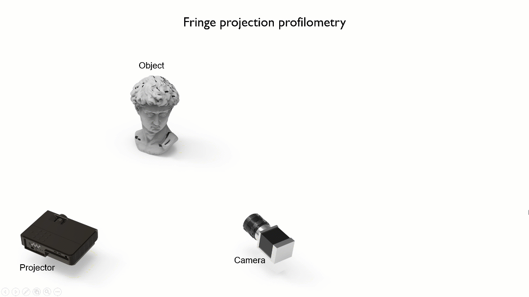 作为光学计量的代表性技术之一,光学相位测量技术具有非接触、高分辨率、高速度和全场自动化等优点,被广泛应用于工业检测、机器视觉、生物医学和纳米结构表征等科学研究和工程实践领域。该技术通过相干光干涉叠加或非相干投影的方式在物体表面生成周期性的结构条纹,并将待测物体的相关物理量(如面形、位移、应变、粗糙度和尺寸)直接或间接地反映在采集到的条纹图案中。如何从单幅条纹图像中高精度地还原复杂面形的相位信息,一直是本领域研究人员不断追求的核心目标。图1显示了条纹投影轮廓术的测量原理。