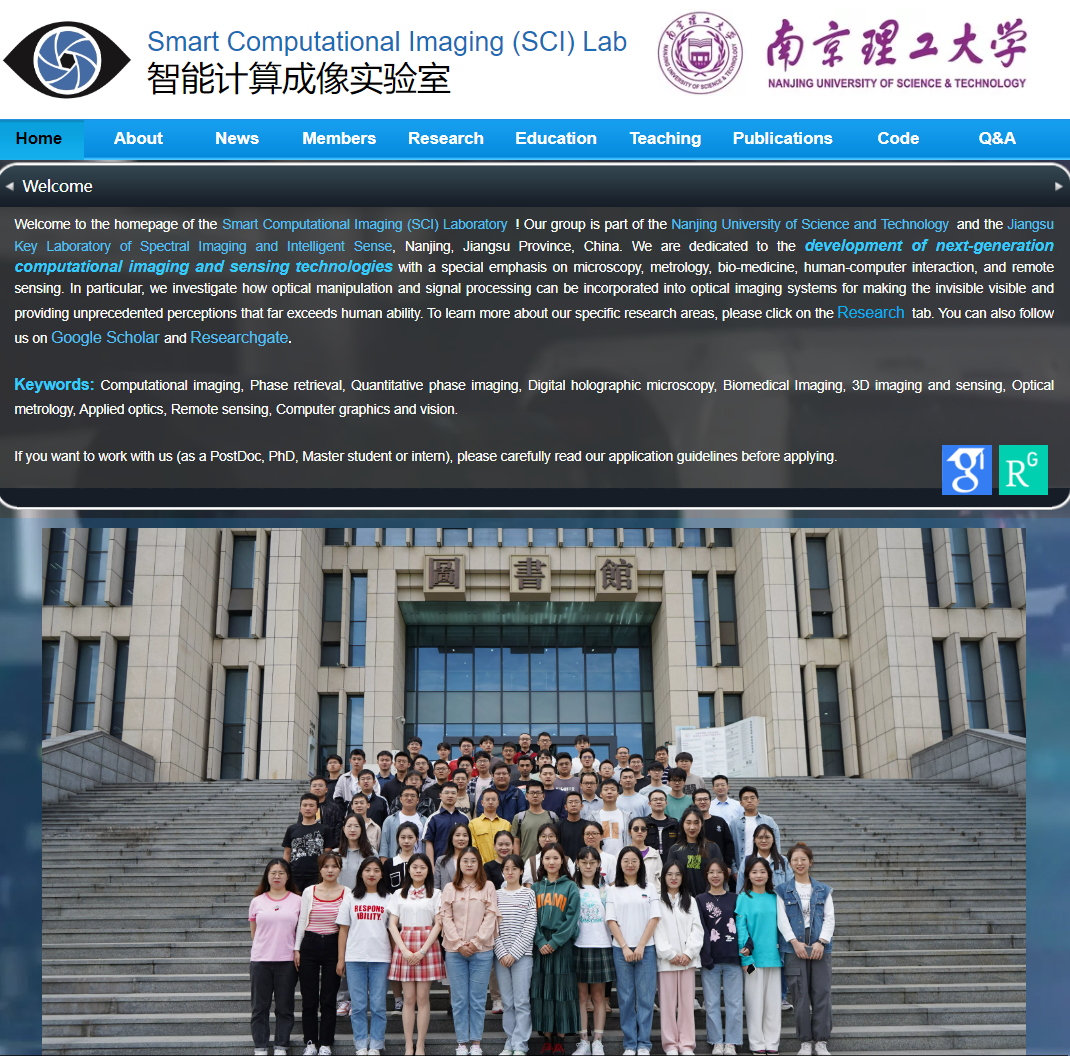 南京理工大学智能计算成像实验室(SCILab: www.scilaboratory.com)隶属于南京理工大学副校长、长江学者陈钱教授领衔的“光谱成像与信息处理”教育部长江学者创新团队、首批“全国高校黄大年式教师团队”。