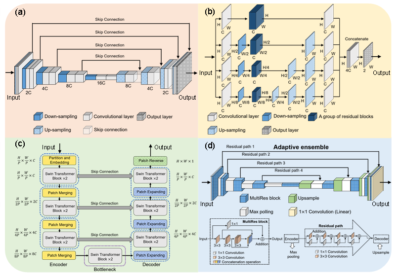 图3 (a) U-Net神经网络模型(基础模型1);(b) 多路径神经网络模型(基础模型2);(c) Swin-Unet神经网络模型(基础模型3);(d) MultiResUNet神经网络模型(自适应集成神经网络)