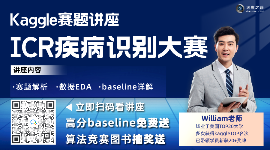 为了帮助同学们冲分拿牌,我邀请了Kaggle大神William老师为同学们带来本次疾病识别大赛的专题讲座。内容包含赛题解析、数据EDA与baseline详解,帮助同学们快速掌握赛题核心思路。