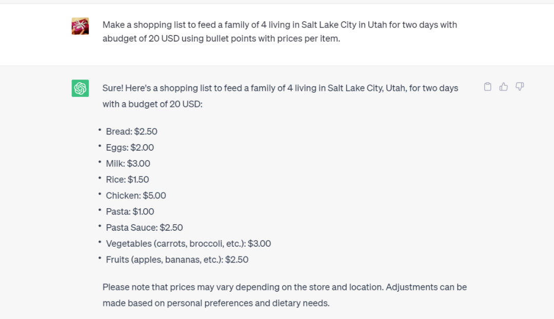 b. Context – … to feed a family of 4 living in Salt Lake City in Utah for two days with a budget of 20 USD…