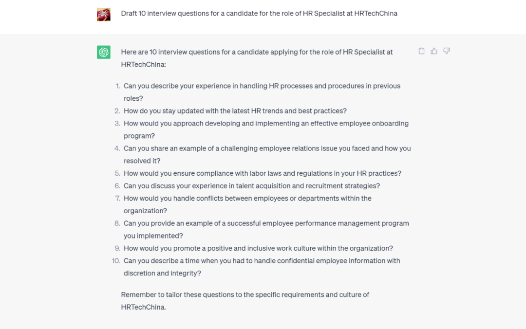 ChatGPT 提示示例:“为[插入职位名称]的候选人草拟10个面试问题。”