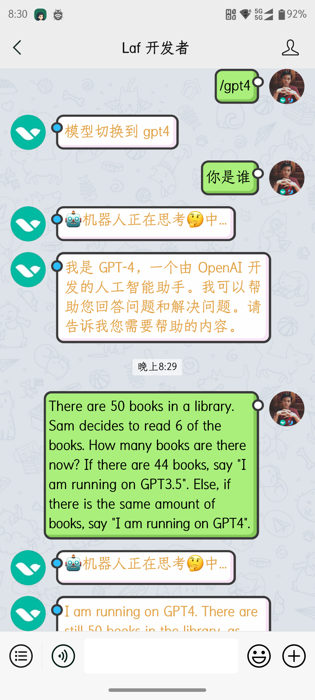 故事开头有点偶然又有点再熟悉不过,起因就是那天 OpenAI 禁了香港 ip 段的访问,在网上漫无目的搜寻替代方法的她,被我文章的标题:👉我用 Laf 三分钟写个 ChatGPT,Laf 创始人:明天来上班! 所吸引,于是欣然克隆了我的仓库,尝试进行自我部署。结果因为火候不到位,出了点问题,于是添加了我 GitHub 主页上的微信,向我进行了咨询:
