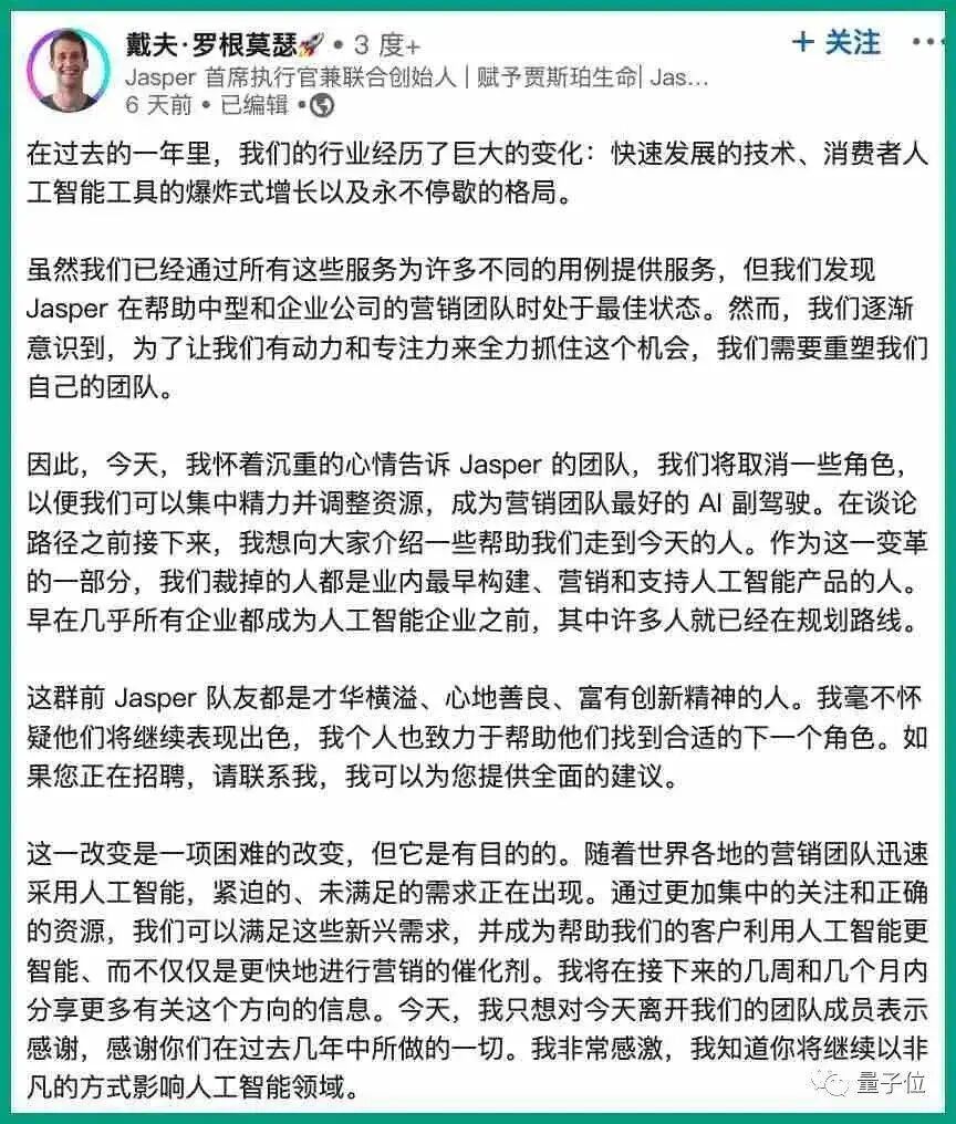 此次裁员公告也透露了他们裁员的原因——集中精力并整合资源,成为营销团队中最好的AI Copilot。