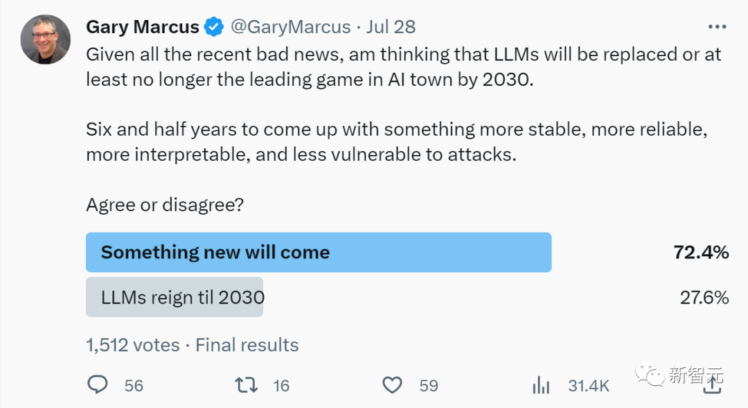 威斯康星大学麦迪逊分校教授、Google研究人员Somesh Jha评论道:这篇新论文可以被视为「改变了游戏规则」,它可能会迫使整个行业重新思考,该如何为AI系统构建护栏。著名AI学者Gary Marcus对此表示:我早就说过了,大语言模型肯定会垮台,因为它们不可靠、不稳定、效率低下(数据和能量)、缺乏可解释性,现在理由又多了一条——容易受到自动对抗攻击。他断言:到2030年,LLM将被取代,或者至少风头不会这么盛。在六年半的时间里,人类一定会研究出更稳定、更可靠、更可解释、更不易受到攻击的东西。在他发起的投票中,72.4%的人选择了同意。现在,研究者已经向Anthropic、Google和OpenAI披露了这种对抗性攻击的方法。三家公司纷纷表示:已经在研究了,我们确实有很多工作要做,并对研究者表示了感谢。不过,用提示技巧绕过之后,生成模型也愿意给我们答案。