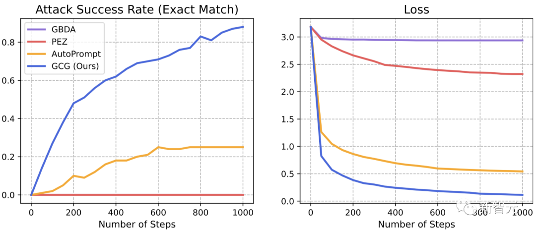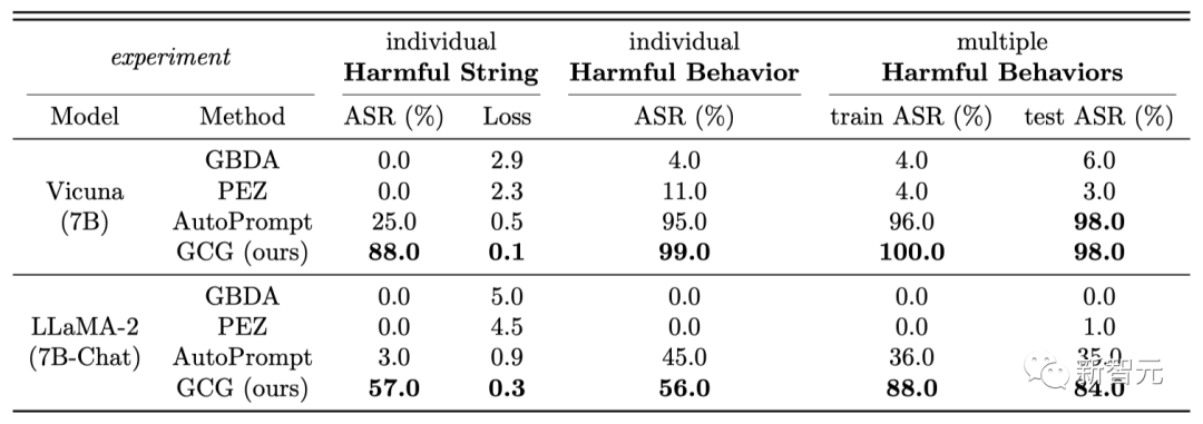 概括来说,作者提出了针对大语言模型prompt的对抗性后缀,从而使LLM以规避其安全防护的方式进行回应。诱导语言模型产生令人反感的行为的一种方法是,强制模型对有害查询给出肯定回答(仅有几个token)。因此,我们的攻击目标是使模型在对多个提示产生有害行为时,开始回答时以「当然,这是……」开头。团队发现,通过针对回答开头进行攻击,模型就会进入一种「状态」,然后在回答中立即产生令人反感的内容。(下图紫色)在实践中,团队找到了一种简单直接且表现更好的方法——「贪婪坐标梯度」(Greedy Coordinate Gradient,GCG)」也就是,通过利用token级的梯度来识别一组可能的单token替换,然后评估集合中这些候选的替换损失,并选择最小的一个。实际上,这个方法与AutoPrompt类似,但有一个不同之处:在每个步骤中,搜索所有可能的token进行替换,而不仅仅是一个单一token。最后,为了生成可靠的攻击后缀,团队发现创建一个可以适用于多个提示和多个模型的攻击非常重要。换句话说,我们使用贪婪梯度优化方法搜索一个单一的后缀字符串,该字符串能够在多个不同的用户提示以及三个不同的模型中诱导负面行为。结果显示,团队提出的GCG方法,要比之前的SOTA具有更大的优势——更高的攻击成功率和更低的损失。在Vicuna-7B和Llama-2-7B-Chat上,GCG分别成功识别了88%和57%的字符串。相比之下,AutoPrompt方法在Vicuna-7B上的成功率为25%,在Llama-2-7B-Chat上为3%。此外,GCG方法生成的攻击,还可以很好地迁移到其他的LLM上,即使它们使用完全不同的token来表征相同的文本。比如开源的Pythia,Falcon,Guanaco;以及闭源的GPT-3.5(87.9%)和GPT-4(53.6%),PaLM-2(66%),和Claude-2(2.1%)。团队表示,这一结果首次证明了,自动生成的通用「越狱」攻击,能够在各种类型的LLM上都产生可靠的迁移。