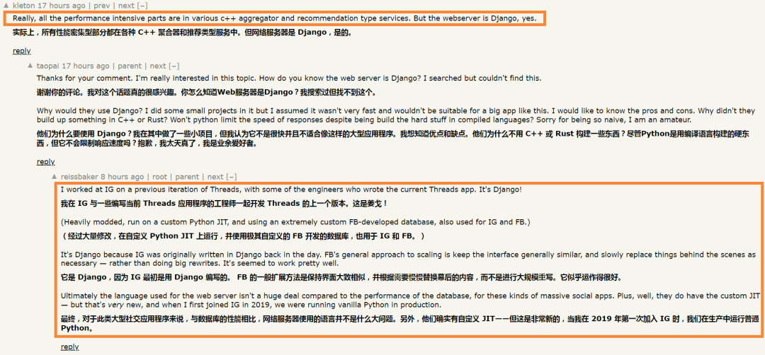 根据 Threads 工程师的介绍,Threads 和 Instagram 一样采用 Django 作为 Web 服务器,所有性能密集型的任务都放到了各种 C++ 聚合器和推荐类型服务中。