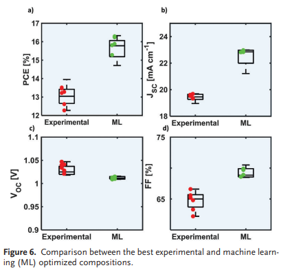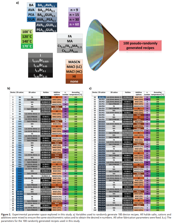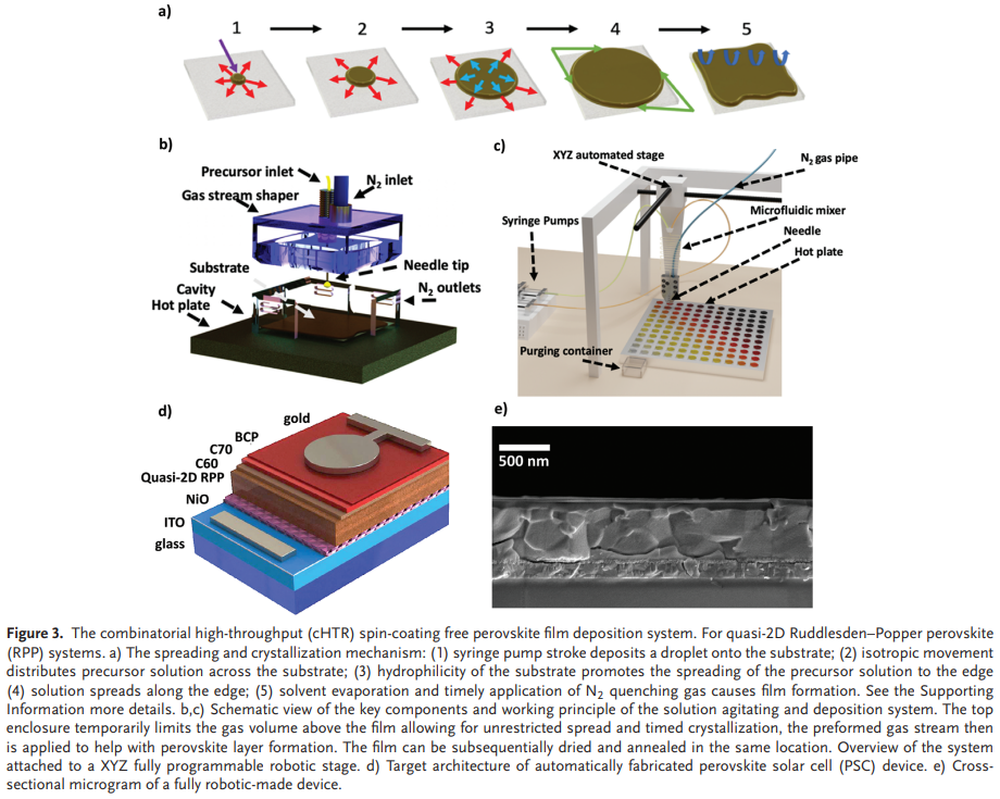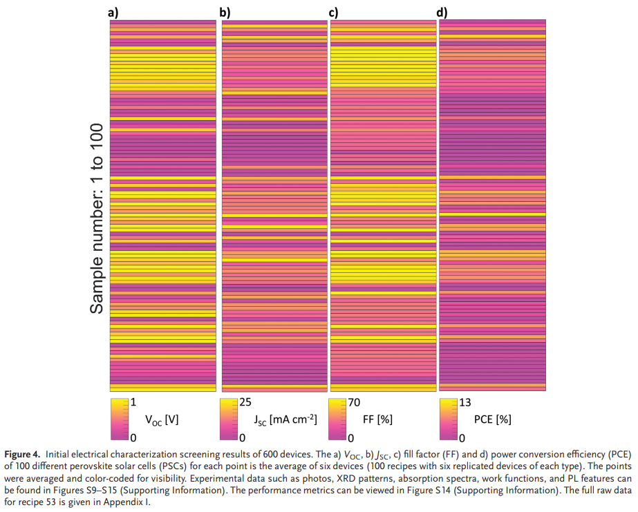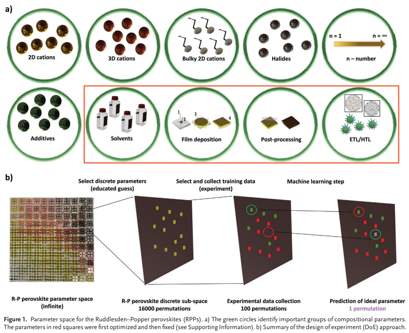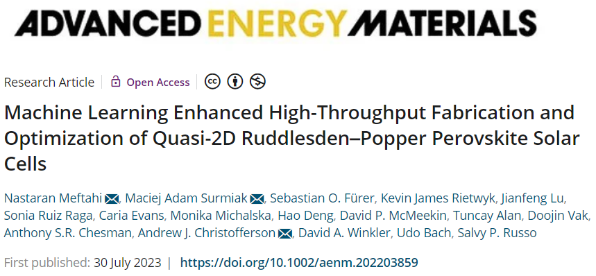 有机-无机钙钛矿太阳能电池因其具有商业竞争力的成本和高功率转换效率而成为下一代廉价太阳能电池板的有希望的候选者。然而,钙钛矿太阳能电池的稳定性较差。钙钛矿太阳能电池的一个新的庞大子集,即准二维Ruddlesden-Popper钙钛矿太阳能电池(准2D RP PSC),与三维金属卤化物钙钛矿太阳能电池相比,具有更高的光稳定性和对环境条件的卓越适应能力。为了加速寻找新的准二维RP钙钛矿太阳能电池,2023年7月30日墨尔本皇家理工大学Nastaran Meftahi&Andrew J. Christofferson&莫纳什大学Maciej Adam Surmiak于AEM刊发机器学习增强了准二维钙钛矿太阳能电池的高通量制造和优化的研究成果,这项工作报告了一项组合机器学习(ML)增强型高通量钙钛矿薄膜制造和优化研究。这项工作设计了一种定制的实验策略,并仅使用无旋涂、可重复的机器人制造工艺生产具有一系列不同成分的钙钛矿薄膜。这些太阳能电池的性能和表征数据用于训练机器学习模型,从而优化材料参数并指导改进材料的设计。新型、ML优化的滴铸准2D RP钙钛矿薄膜可生产功率转换效率高达 16.9%的太阳能电池。https://onlinelibrary.wiley.com/doi/10.1002/aenm.202203859