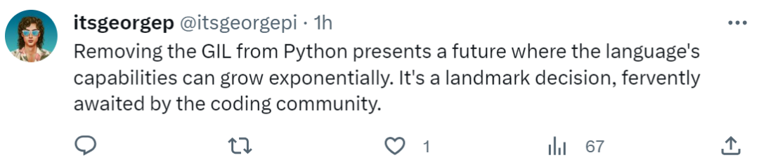 「Python 中的 GIL 将不复存在,这是人工智能生态系统领域中的巨大胜利。」PyTorch 核心维护者 Dmytro Dzhulgakov 感慨道。GIL 是什么?GIL 的全称是 Global Interpreter Lock(全局解释器锁),它不是 Python 独有的,而是在实现 CPython(Python 解释器)时引入的一个概念。我们可以将 GIL 理解为一个互斥锁,用来保护 Python 里的对象,防止同一时刻多个线程执行 Python 的字节码,从而确保线程安全。图源:https://realpython.com/python-gil/然而,GIL 存在一个弊端,即在同一时刻只能有一个线程在一个 CPU 上执行,无法将多个线程映射到多个 CPU 上,使得 Python 并不能实现真正的多线程并发,从而降低了执行效率。现在,Python 团队已经正式接受了删除 GIL 的这个提议,并将其设置为可选模式,可谓是利好广大开发者。做出这一贡献的是一位来自 Meta 的名叫 Sam Gross 的软件工程师,他花费了四年多的时间才完成这一工程。在得知这一消息后,大家纷纷叫好,深度学习三巨头之一的 Yann LeCun 发文祝贺:没有了 GIL,现在,Python 代码可以自由的执行多线程了。「Python 中终于没有 GIL 了!」「这是一个里程碑式的决定,是编码社区所热切期待的。」具体细节如何,我们接着看下文。CPython 核心开发者 Thomas Wouters 撰文描述了 Python 中的无 GIL 细节,并对未来发展做了展望。非常感谢所有人对无 GIL 提议的反馈,整体上都持积极的支持态度。指导委员会打算接受无 GIL 提议,并就以下具体细节与大家分享。我们的基本设想是: