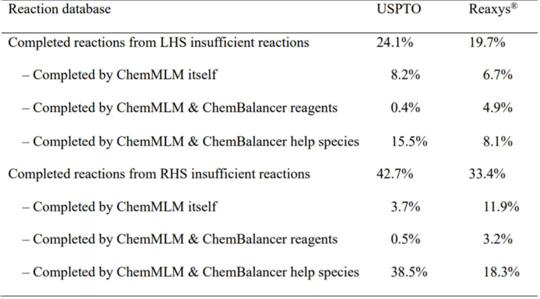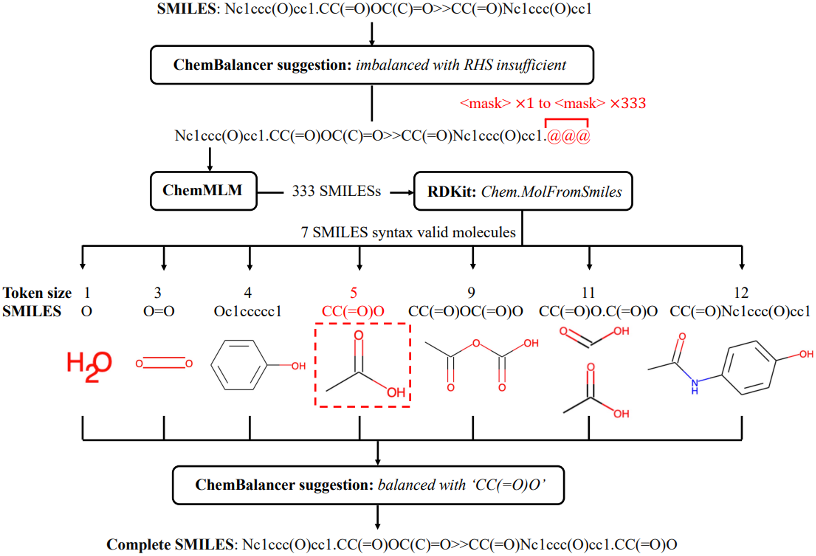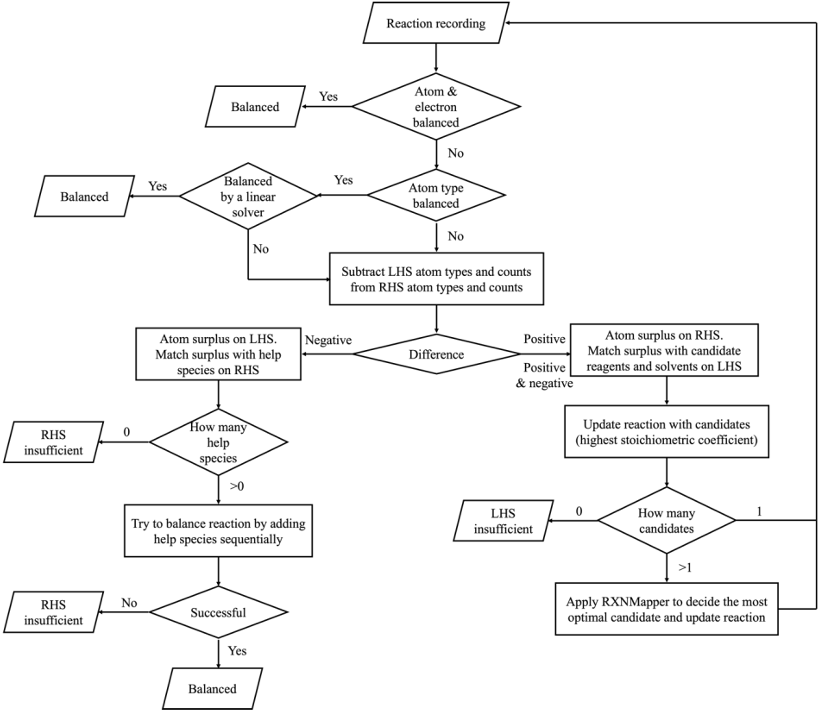 图1 Reaxys中的反应记录,反应试剂中的氢气参与了反应,但未出现在反应式中配平不缺项的化学反应是一个简单的线性代数问题,但对于缺项化学反应的补全目前尚无较好的解决方案。由于缺乏充足的不缺项、配平的化学反应数据,单纯基于反应模板的方法或基于机器学习的方法都不可靠,二者的组合可能是解决问题的最佳方案。来自剑桥大学的Zhang Chonghuan等人最近提出了一种结合经验与语言模型的化学反应补全与配平方案1,目前发表在ChemRxiv中。——方法简述——基于经验的补全与配平:ChemBalancer化学反应数据库中的少部分反应已经配平,或可以通过较为简单的方式补全并配平。作者提出了ChemBalancer工具,用于判断反应是否已配平,并根据反应是左侧(Left hand side,LHS)缺项还是右侧(Right hand side,RHS)缺项分别处理补全操作。ChemBalancer的计算流程如图2所示。作者定义配平的反应是左右两侧各类型重原子数和总电荷都相等的反应。未配平的反应首先通过线性代数计算反应系数尝试配平,但限制最大的反应系数为6以防止产生假阳性结果。无法配平或左右两侧所含原子类型不一致的反应,需要判断其为LHS缺项还是RHS缺项。对LHS缺项的反应,作者在从USPTO数据中提取到的全部反应试剂和溶剂分子中选出一个能配平反应的分子;若存在多种可能,所有补全结果会通过RXNMapper2工具计算原子编号的confidence score,并保留排名第一的结果。对RHS缺项的反应,作者人工定义了仅包含32个分子和离子的库(help species),从中选出能配平反应的物种。如果LHS和RHS同时缺项,则优先处理LHS缺项,但允许在LHS补全得不到结果时,将help species也用于补齐LHS缺项。ChemBalancer无法处理的LHS和RHS缺项将通过后续的语言模型处理。