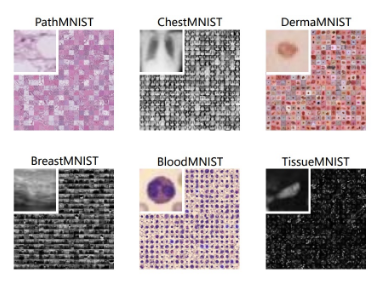 MedMNIST,这是 10 个预处理的医学开放数据集的集合。MedMNIST 经过标准化处理,可在轻量级 28x28 图像上执行分类任务,无需背景知识。它涵盖了医学图像分析中的主要数据模式,在数据规模(从 100 到 100,000)和任务(二元/多类、序数回归和多标签)上具有多样性。MedMNIST 可用于教育目的、快速原型设计、多模式机器学习或医学图像分析中的 AutoML。此外,MedMNIST Classification Decathlon 旨在对所有 10 个数据集上的 AutoML 算法进行基准测试