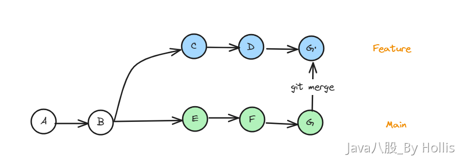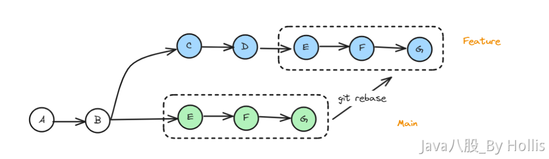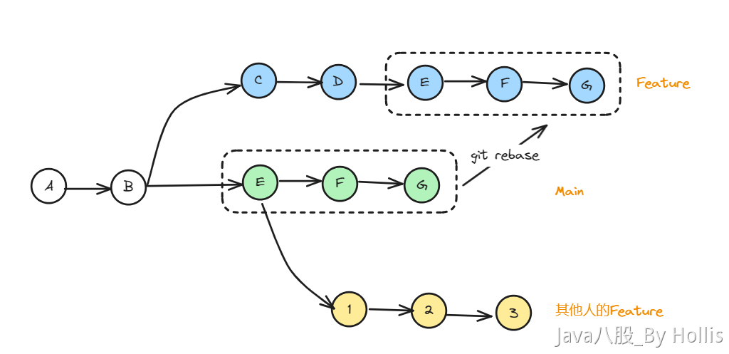 如上图,就是我们将Main中新的提交,通过rebase的方式合并到我们的Feature分支中。(另外我出了一份Java面试宝典,里面有600多道面试常考题目)