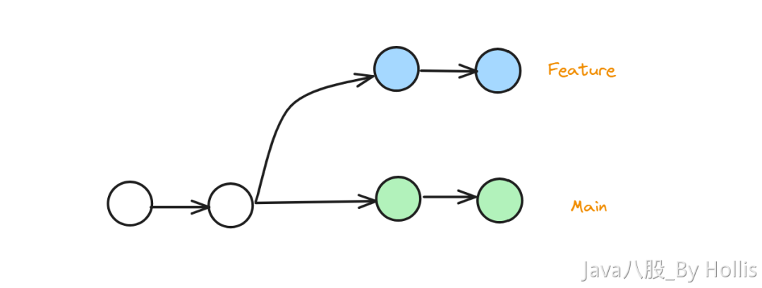 在介绍区别之前,我们先看下当我们从主干(Main)创建了一个新的分支(Feature)开始开发代码时,然后另外有人把自己的代码提交到主干(Main)之后,就会产生分叉的提交记录。