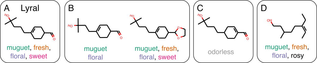 图1:结构相似的分子不一定有相似的气味描述符。A.新铃兰醛,参考分子。B. 具有相似结构的分子可以共享相似的气味描述符。C. 然而,一个很小的结构变化就可以使分子变得无味。D.此外,较大的结构变化可以使分子的气味基本保持不变。引自Ohloff,Pickagen和Kraft[28]。