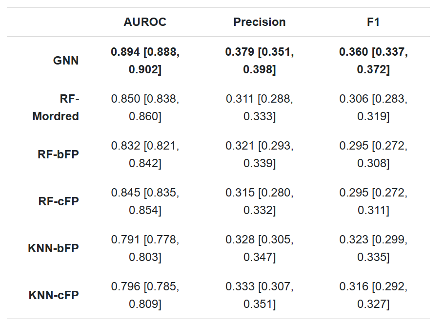 我们将数据集中每个气味描述符的分类性能作为一个多标签分类问题进行基准测试。我们将GNN模型与随机森林模型(RF)和k近邻模型(KNN)在基于位的RDKit指纹(bFP)、基于计数的Morgan指纹(cFP)和Mordred特征上进行了比较。我们报告了几个指标(表1),因为每个指标可以突出不同的性能特征。对于其余的分析,我们主要比较模型的平均AUROC,平均气味描述符;按标签划分的AUROC性能如图4所示。我们在cFP和bFP特征上训练了非基于图的全连接神经网络,但它们的性能与RF模型没有区别(数据未显示)。