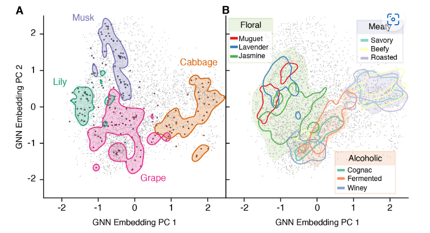 图5:作为学习气味空间的GNN模型嵌入的二维表示。分子被表示为单个点。阴影和轮廓区域是标记数据分布的核密度估计。A.四个低共现的气味描述符在嵌入空间中的重叠度很低。三种一般的气味描述(花香、肉味、酒精味)在它们的范围内都包含了更具体的标签。分子指纹等效分析见补充图S3。