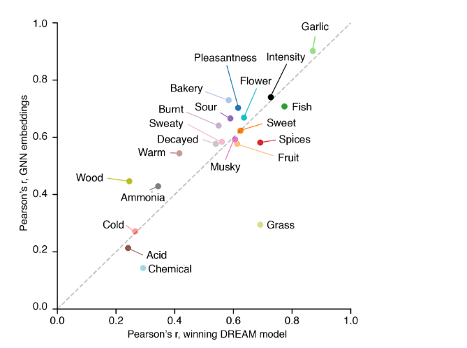 图8:GNN和最佳基线模型在DREAM嗅觉预测挑战中的预测性能。皮尔逊的r代表DREAM挑战的获胜者(对于大多数气味,龙特征子集上的随机森林)与训练在GNN嵌入上的RF(按气味描述符分解)。灰色虚线表示两种模型的性能相同。在对角线以上的数据点表示更好的GNN预测性能。虽然GNN模型的平均值通常较高,但最先进的模型和GNN在统计上都无法区分。
