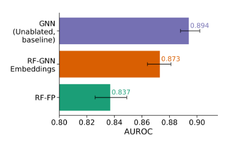 图7:先前残留气味的平均AUROC。单标签消融任务中所有标签的平均AUROC评分。误差条表示95%置信区间。顶部的条形图表示模型在所有标签上训练的性能。中间的条形图表示随机森林模型的性能,该模型使用在(N−1)个气味标签上训练的模型的GNN嵌入进行训练。底部的条形图表示经过摩根指纹计数训练的随机森林。