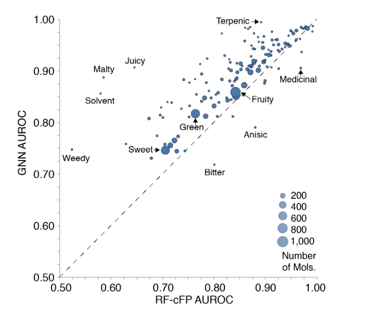 图4:RF-cFP和GNN的比较,按气味描述符分解。每个点代表一个气味描述符,大小代表正面例子的数量。GNN在几乎所有气味描述符上都优于RF-cFP。