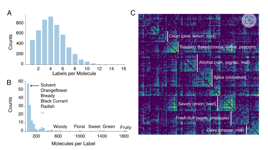 图3:数据集概述。A.气味描述符频率分布。B.标签密度分布。气味描述符的共现矩阵。10个最常见的描述符被移除以保持视觉清晰度,剩余的描述符使用光谱聚类重新排序。突出显示了主要气味组及其示例。颜色范围是在对数尺度上的,并且标准化使得每行和每列之和为1。