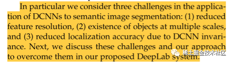 是不是发现和DeepLabV1博客的结构很像呢,在V2论文的INTRODUCTION中也首先提出了DCNN应用于语义分割的三个挑战,如下图所示: