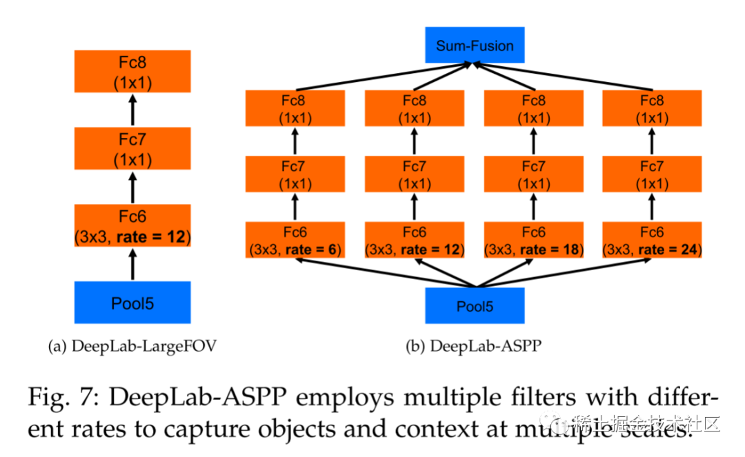 大家还记得在DeepLabV1中提到的LargeFOV结构吗,不记得的话点击☞☞☞去了解下叭。🍄🍄🍄那么在DeepLabV2中就没有使用LargeFOV结构了喔,而是用的ASPP结构。其实通过上图你可能就会发现ASPP就像是在LargeFOV的基础上多并联了几个分支,即增加了多尺度信息,所以有了ASPP就用不着LargeFOV模块啦。🥗🥗🥗当然了,V2的论文中也给出了LargeFOV和ASPP的详细结构,如下图所示: