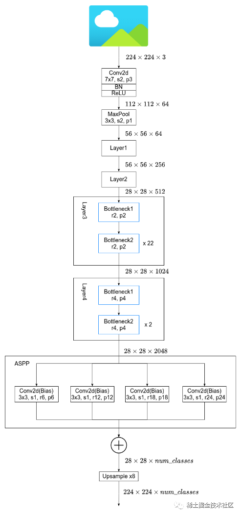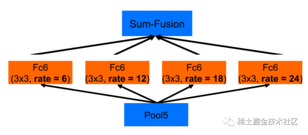 这个图已经非常清晰的展示了ASPP的结构了,但有一点需要大家注意一下,即上图这两个结构都是基于backbone为VGG16绘制的【DeepLabV2中将backbone换成了resnet】,但是不管采用哪种backbone,ASPP结构的核心思想都是一样的,这里稍微来谈谈以resnet为backbone的ASPP结构是什么样的,如下图所示: