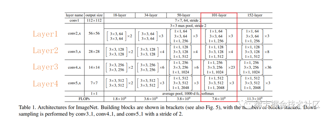 呀呀呀,在上一小节已经透露了,DeepLabV2使用的backbone为resnet,这可以说是最常见的一种网络了,是由咱们中国人何恺明大佬提出的,还不清楚的快点击☞☞☞学起来叭。这里为方便读者阅读,贴出resnet的相关参数,如下图:【以resnet101为例】