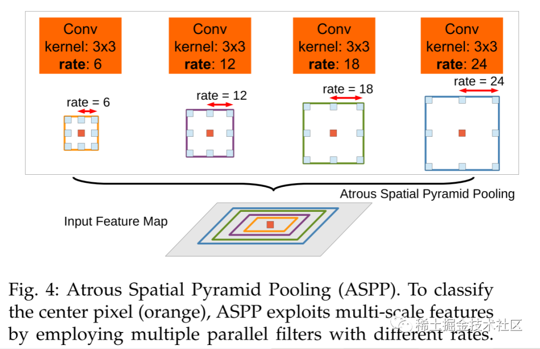 从上图可以看到ASPP模块是在输出的特征图上并联了四个分支,每个分支上采用了卷积核大小为3×3、膨胀系数依次为6、12、18、24的空洞卷积,以此实现每个分支具有不同的感受野大小,也就具有了解决目标多尺度问题的能力。🏆🏆🏆