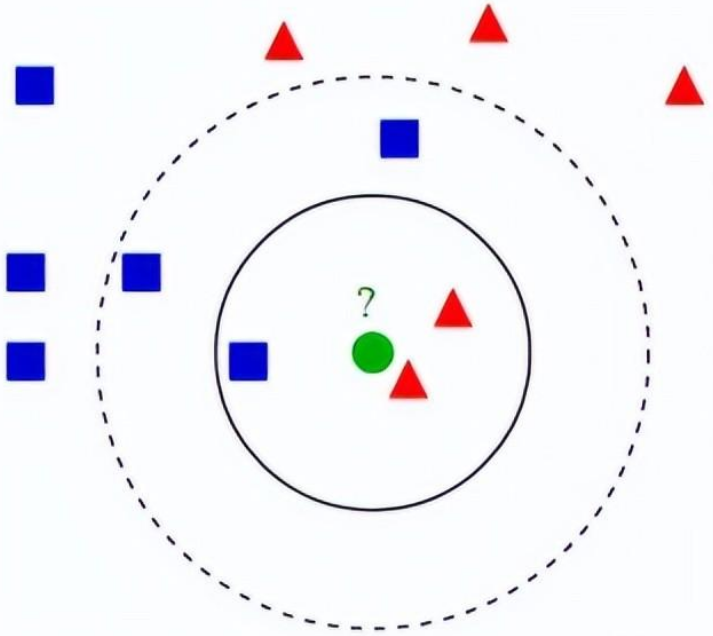 KNN算法的基本介绍:假若一个特征空间中大多数的样本属于某一个类别,则在这个特征空间中,k个最相似的样本也属于这个类别。该算法由两个步骤组成:(1)对于一个给定的搜索训练集按一定距离度量,来找到一个 的值。(2)在这个KNN当中,根据大多数分为一致的类来进行分类。不同形状的点,为不同标签的点。其中绿色点为未知标签的数据点。现在要对绿色点进行预测。由图不难得出:如果k=3,那么离绿色点最近的有2个红色三角形和1个蓝色的正方形,这3个点投票,于是绿色的这个待分类点属于红色的三角形。如果k=5,那么离绿色点最近的有2个红色三角形和3个蓝色的正方形,这5个点投票,于是绿色的这个待分类点属于蓝色的正方形。